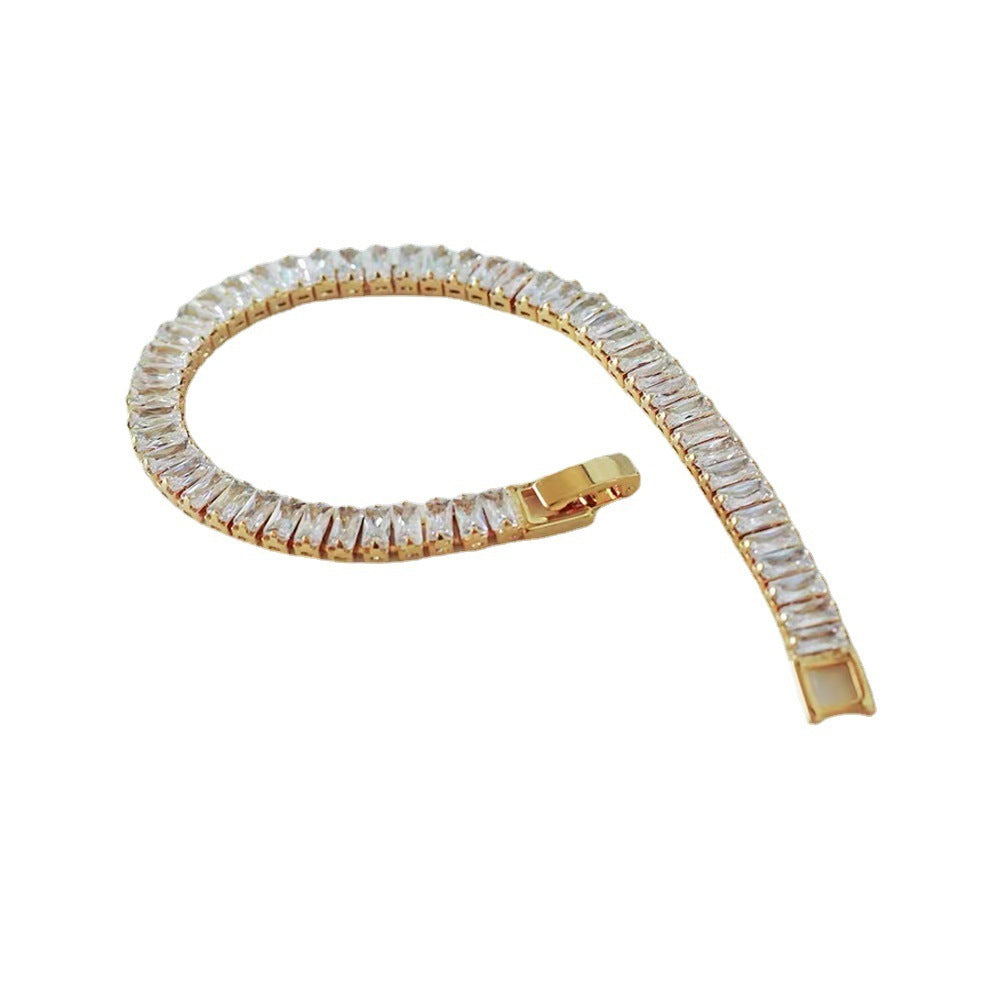 A beautiful classic with a modern shine. Adeline features radiant baguette, cut stones set in gold. This bracelet brings effortless elegance to any look, perfect alone or stacked for extra sparkle.