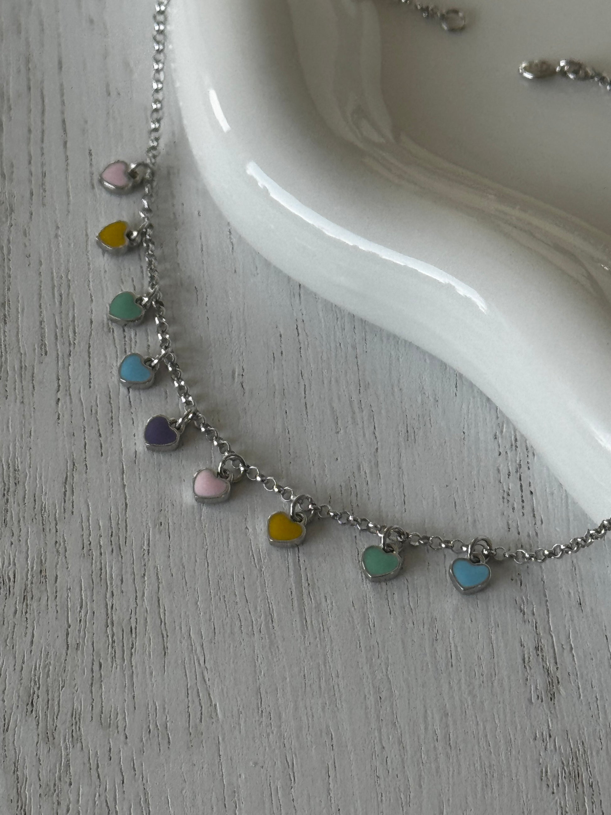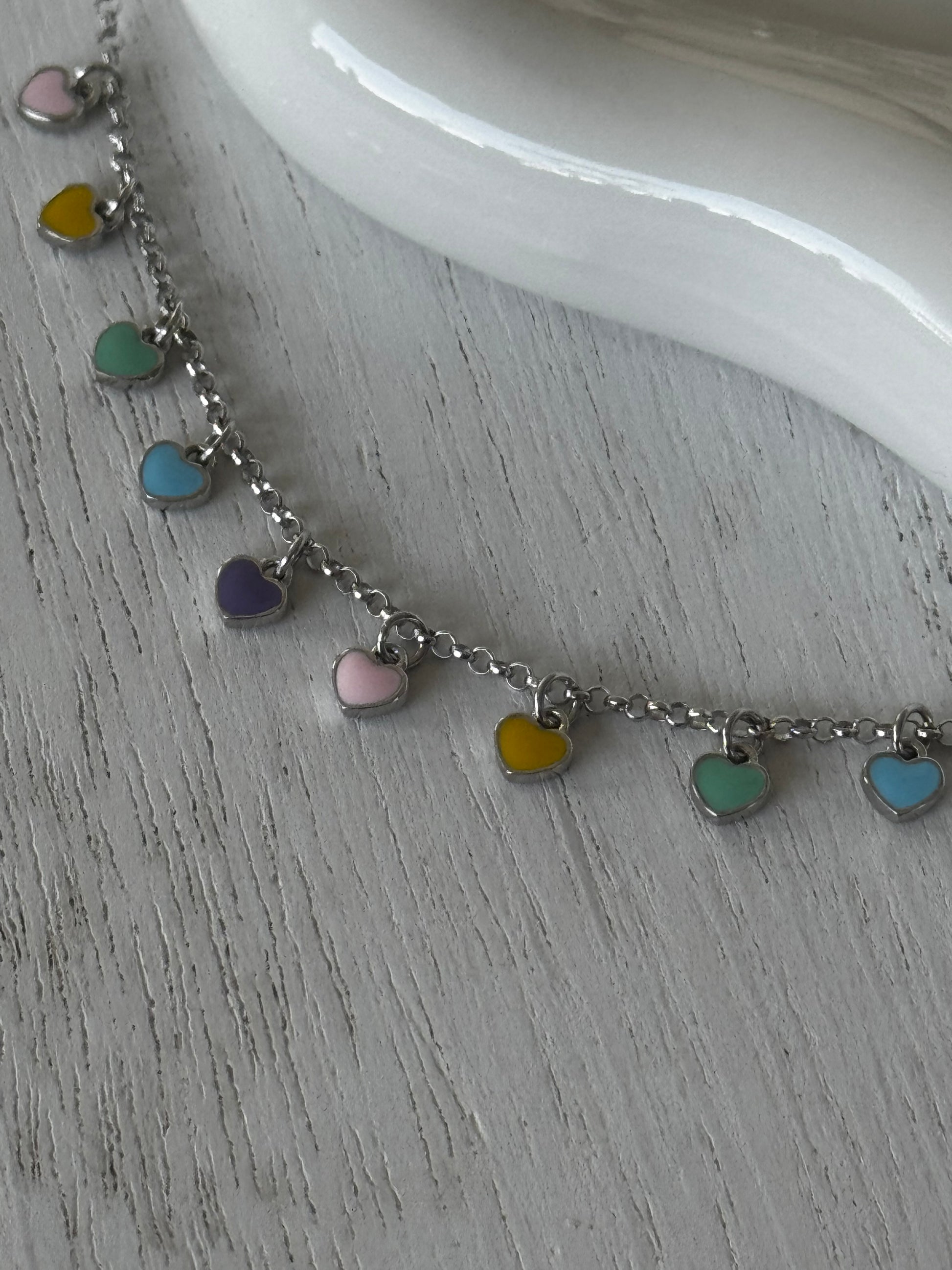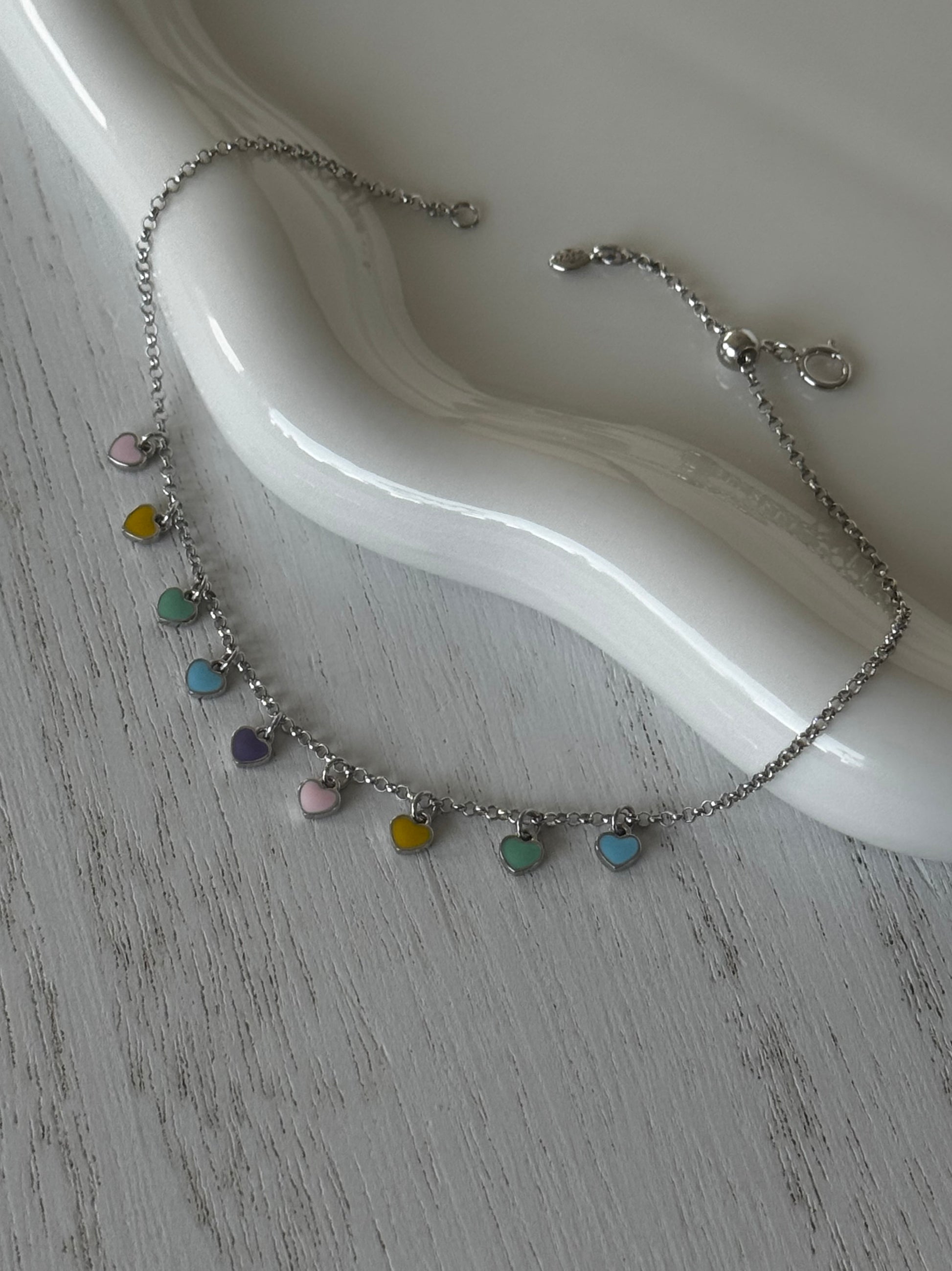 A delicate dance of color for your ankles, this charming anklets features dainty, shimmering heart charms in a rainbow of hues. Each tiny heart catches the light with every step, adding a playful whisper of romance to your look, whether barefoot on the beach or dressed for a summer soiree.
