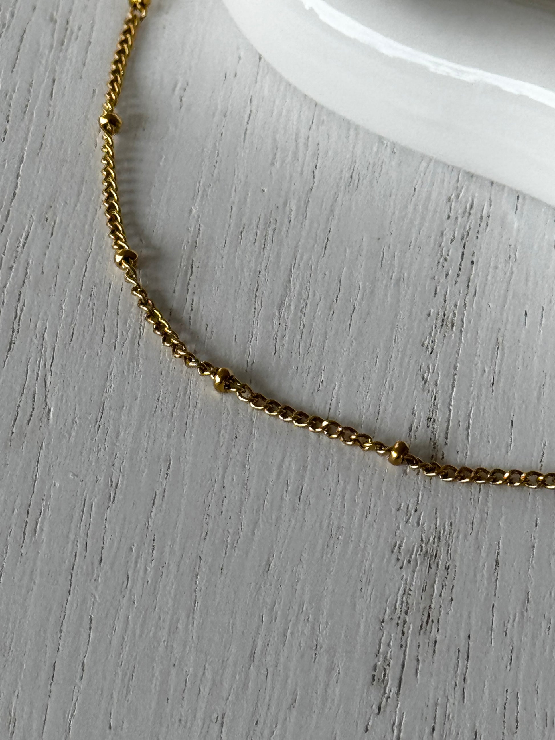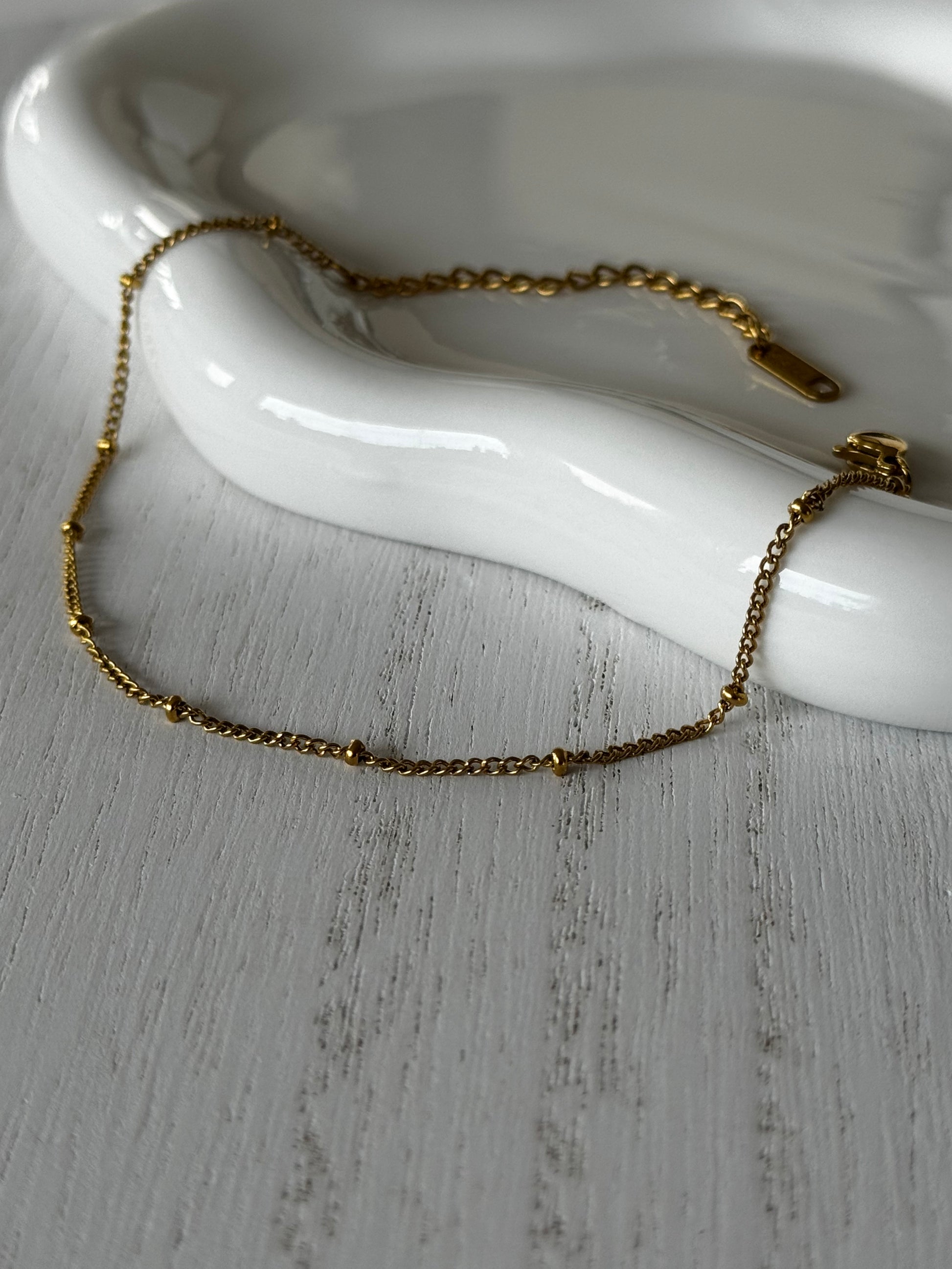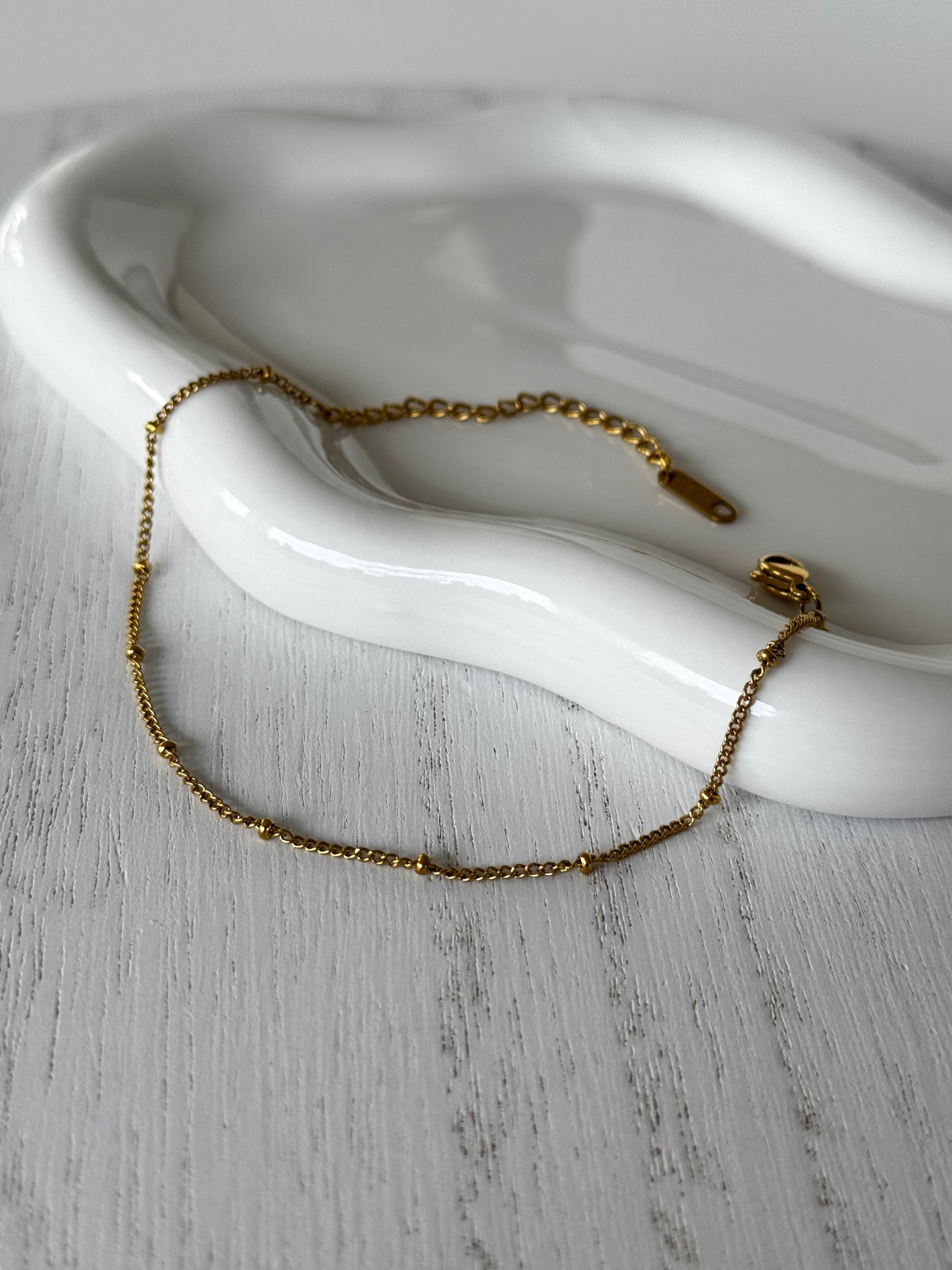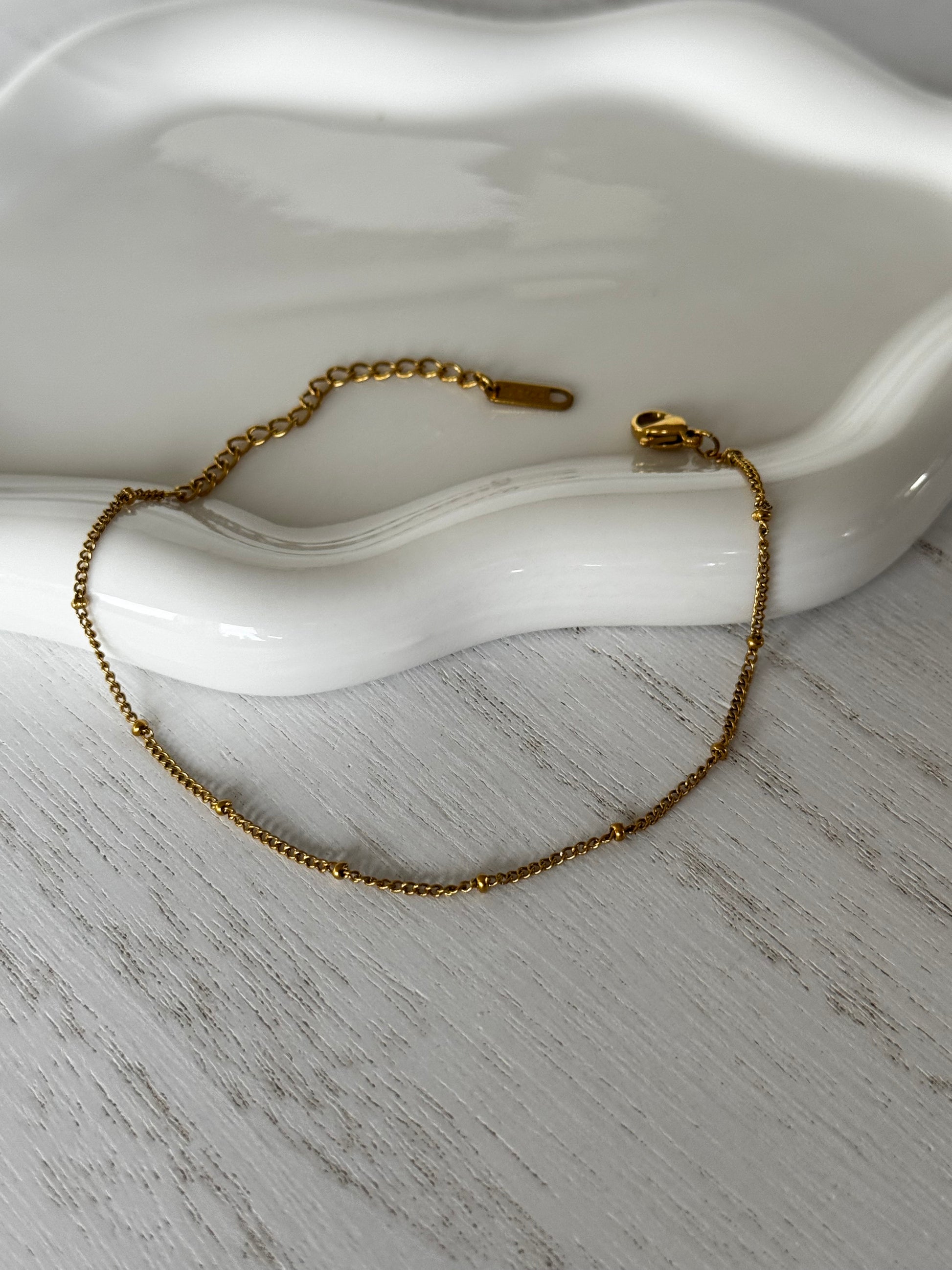 Gracefully crafted in gold, this anklet designed with a fine chain accented by delicate little beads. Its subtle shimmer brings effortless charm, making it an elegant finishing touch to any look.