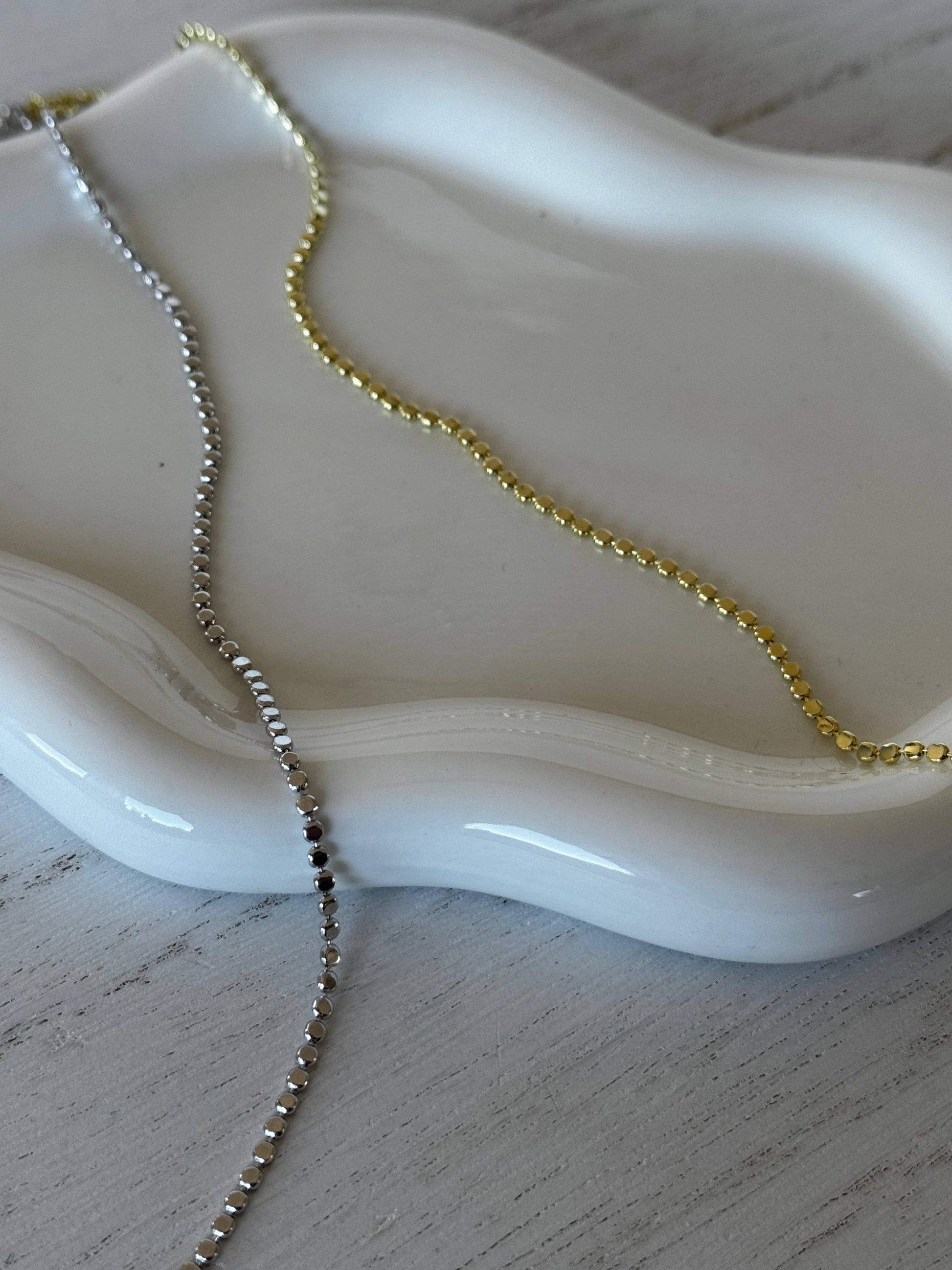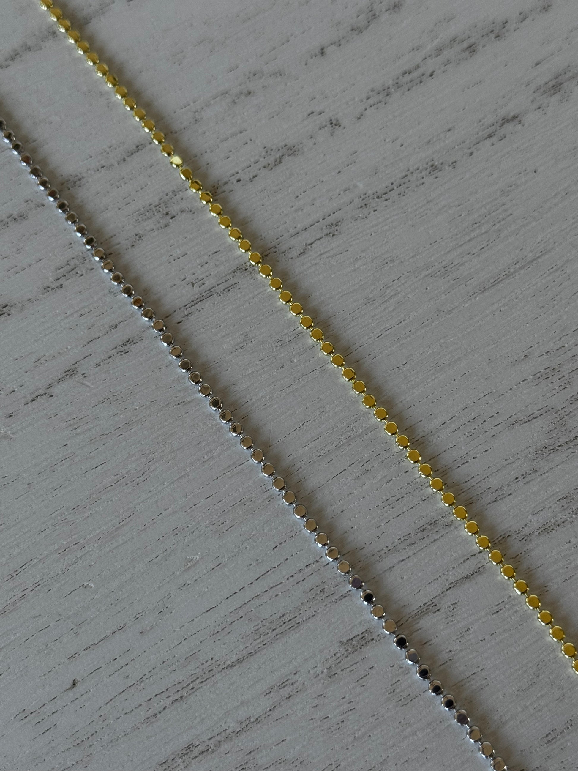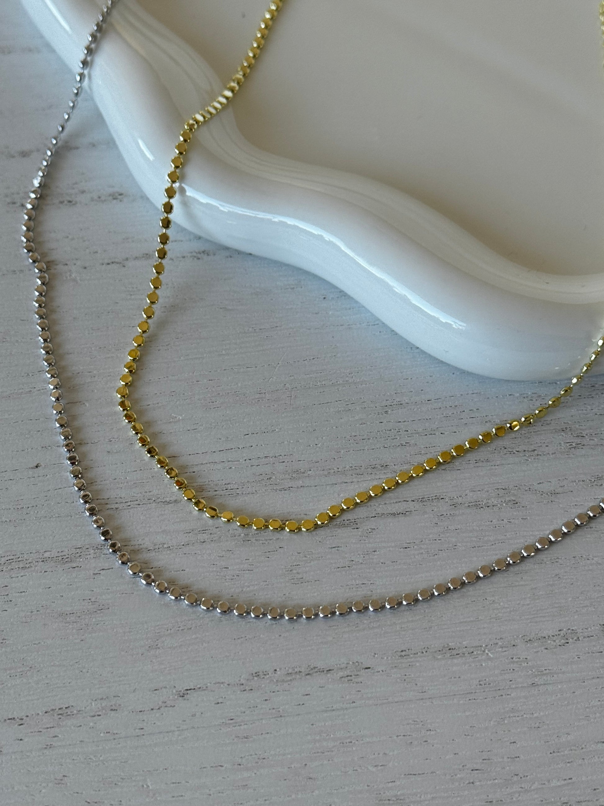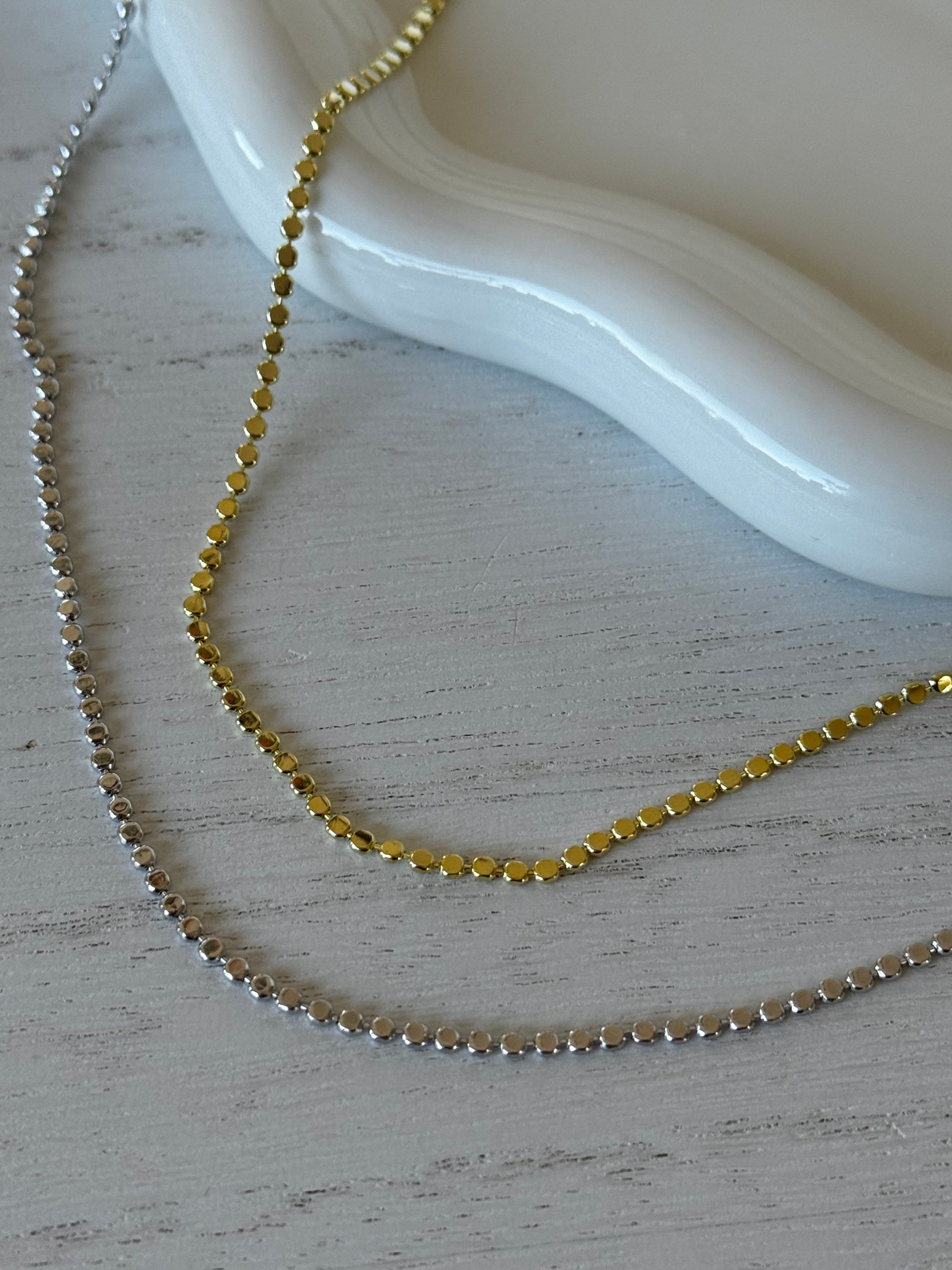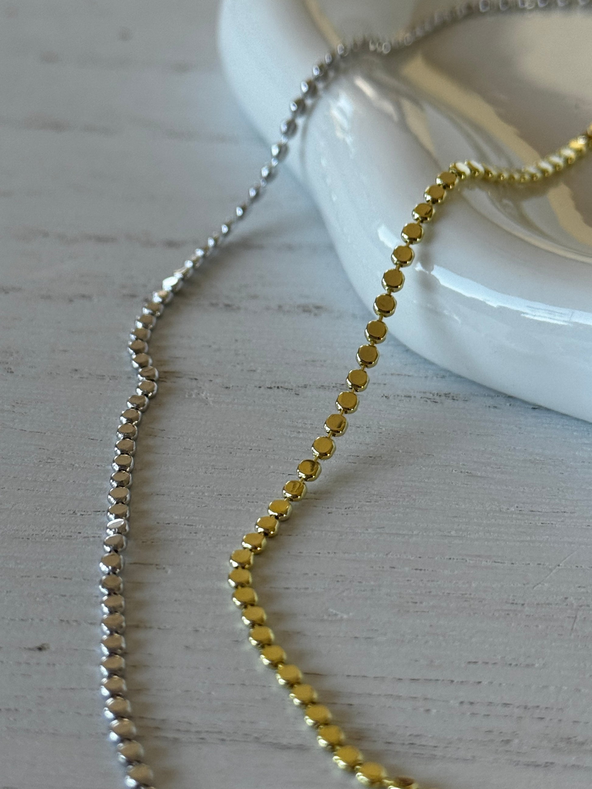 Very unique choker necklace, Cassidy features a delicate strand of small, round, shiny silver discs that catch the light with every movement. This minimalist design offers a modern, effortless charm. It's the perfect necklace for layering or wearing solo as a subtle statement piece.