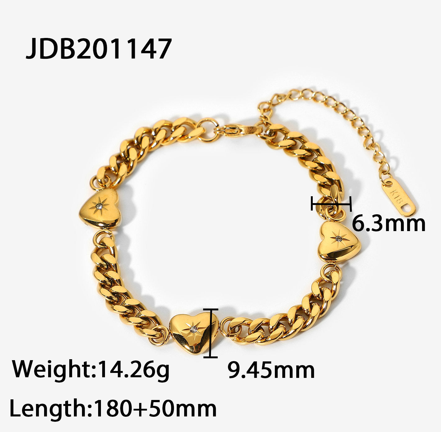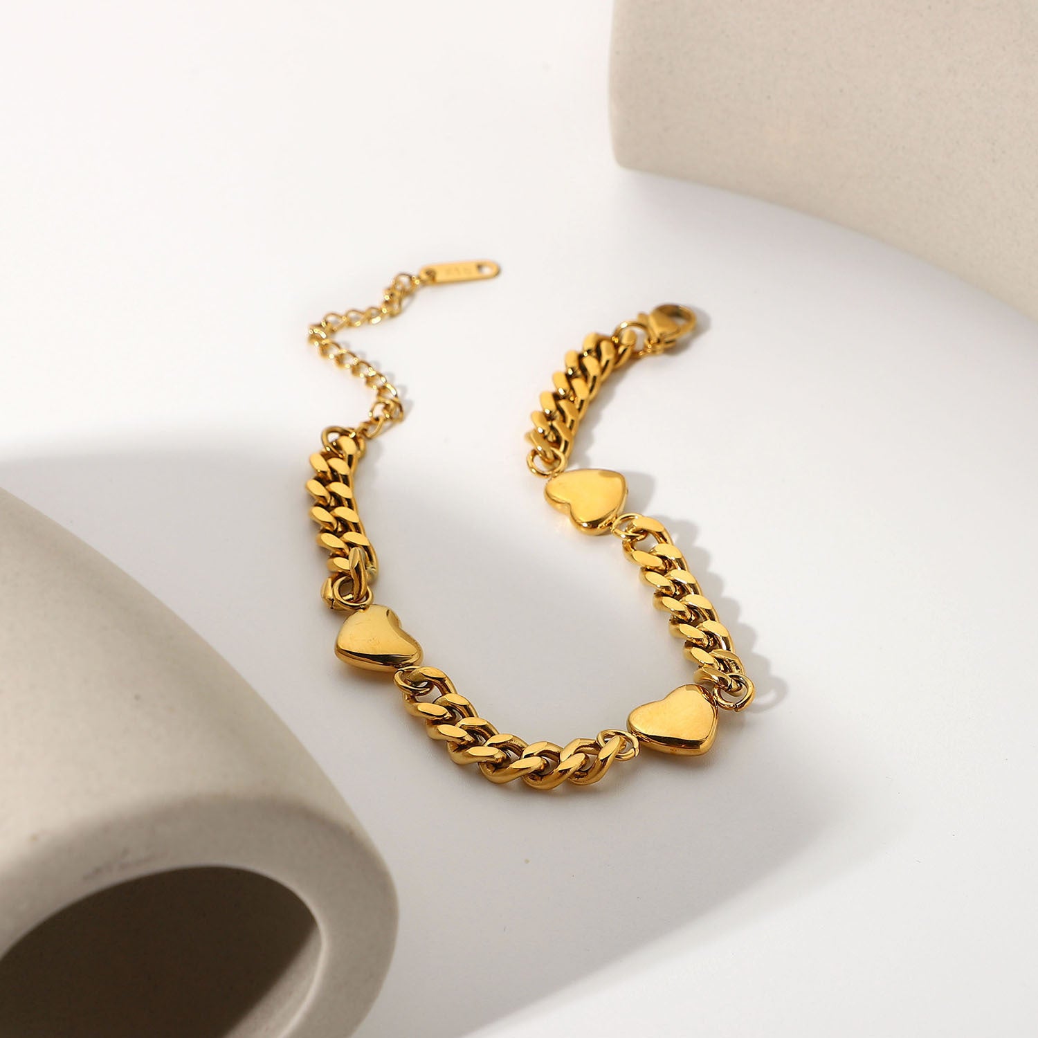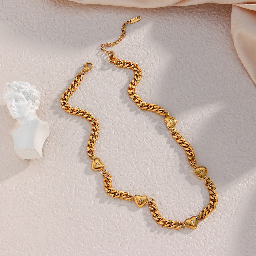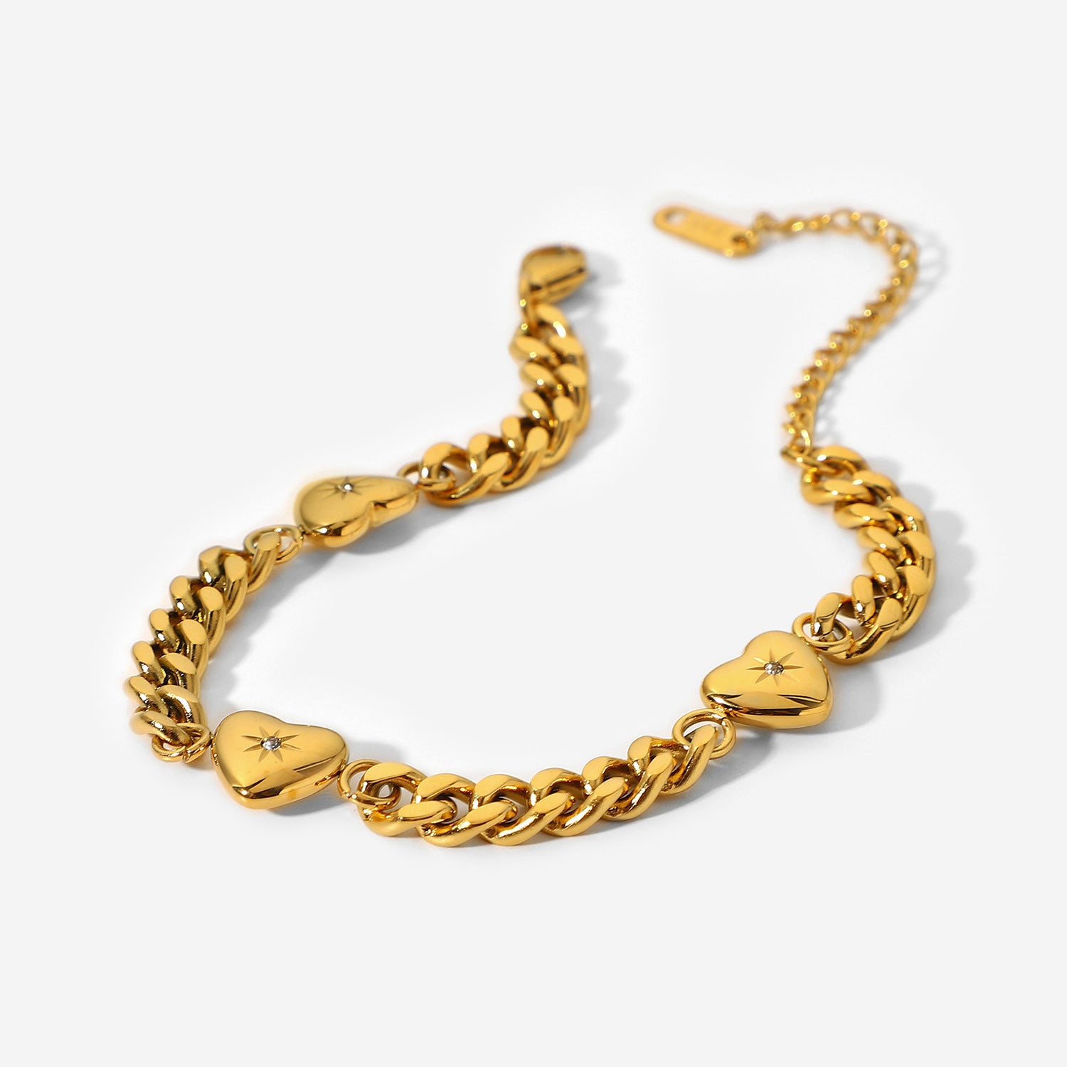 Bold yet romantic, this jewelry set pairs a statement necklace with a matching bracelet, both crafted in gleaming gold chunky chains. Nestled seamlessly within each chain is a radiant heart pendant, designed as though the chain itself embraces it. At the heart's center, zircons shimmer with every movement, adding a touch of sparkle to the bold design.