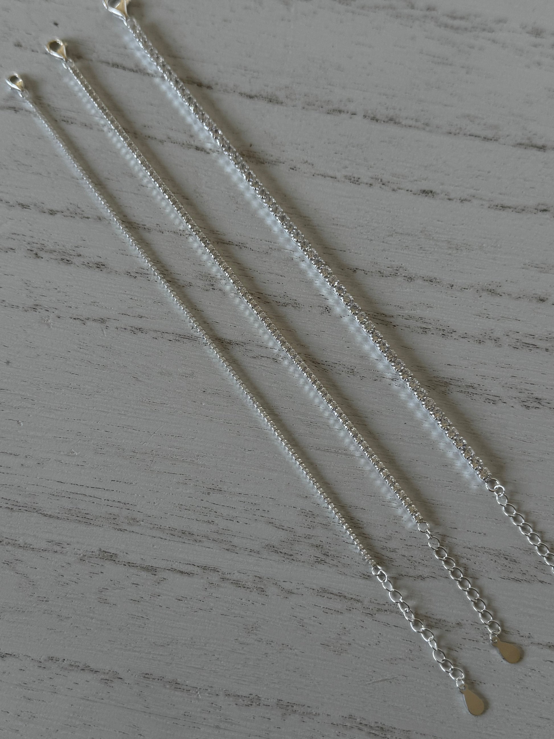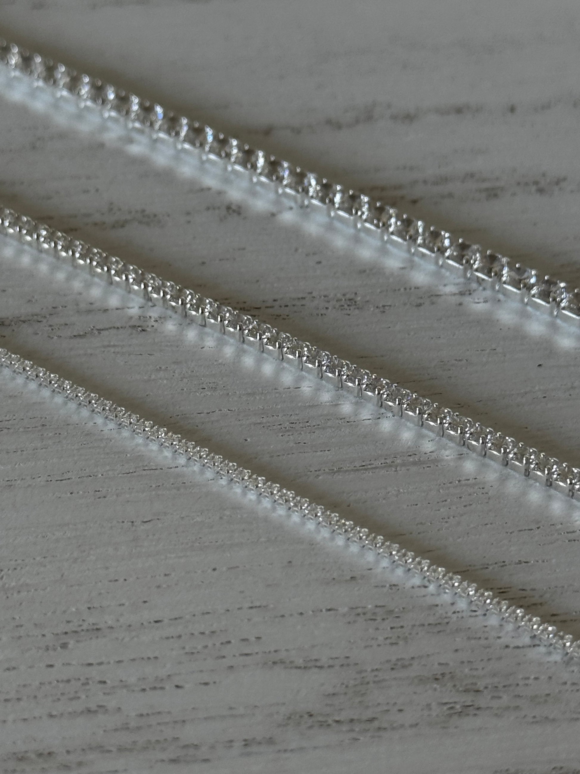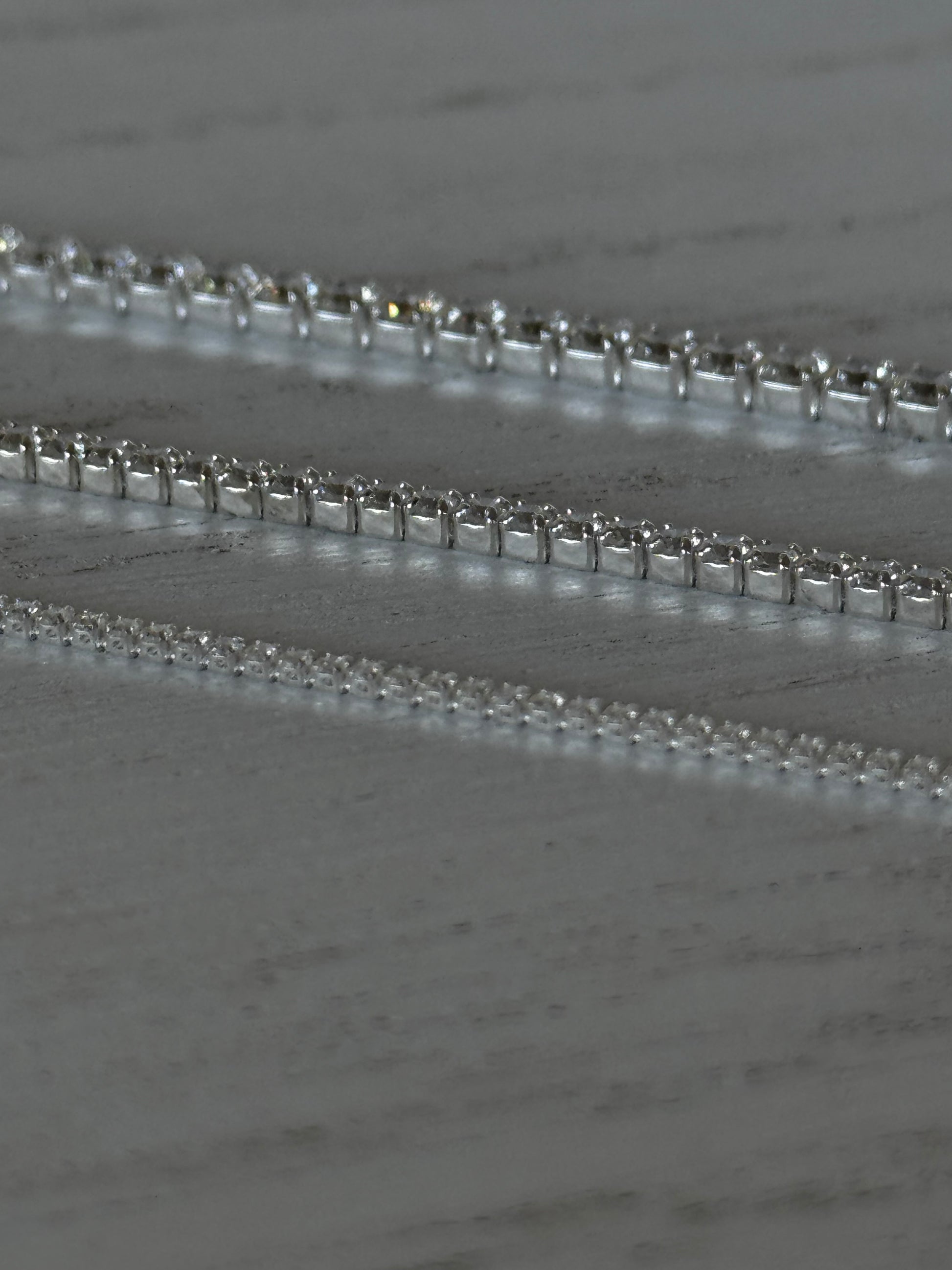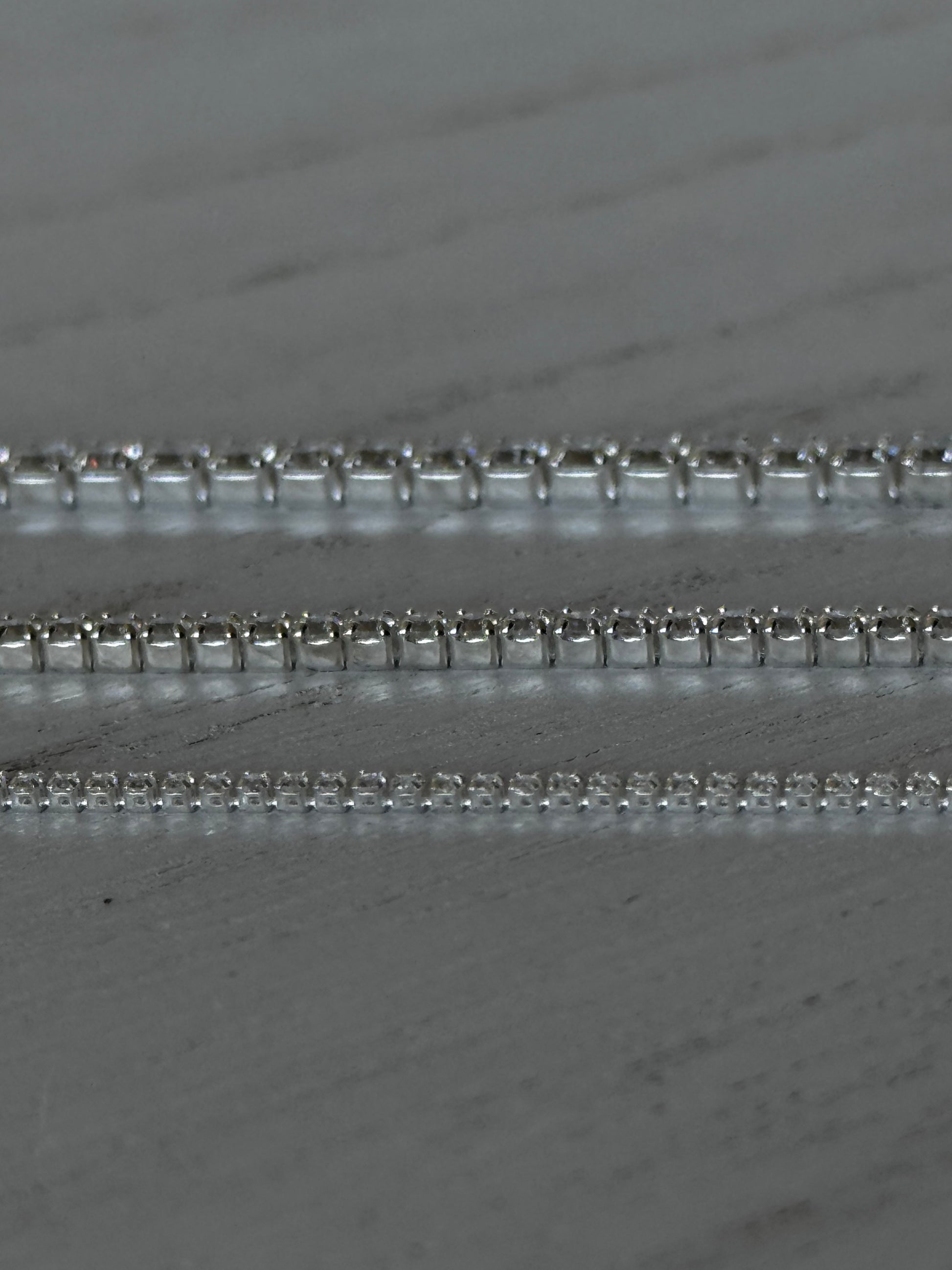 Such elegance and purity with this tennis bracelet, a continuous line of individually set, sparkling cubic zirconia. Available in three sizes, 1mm, 2mm and 3mm diamonds, perfect to suit your own style.