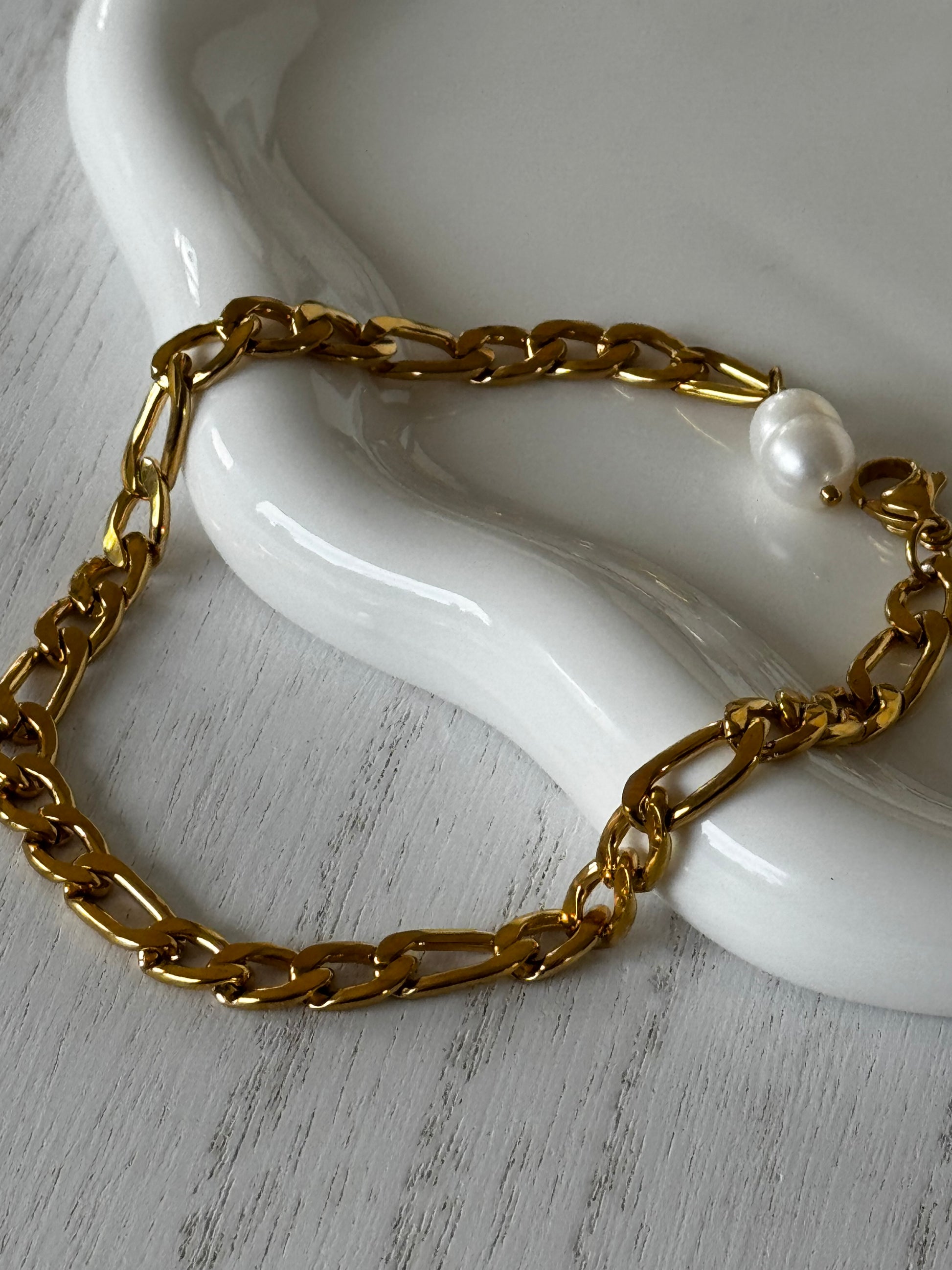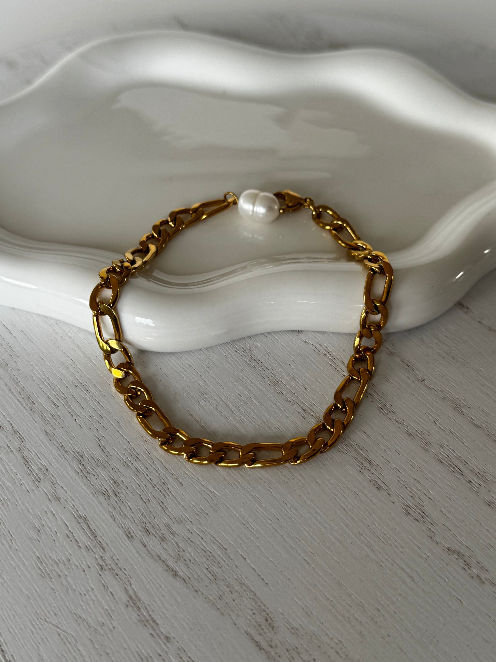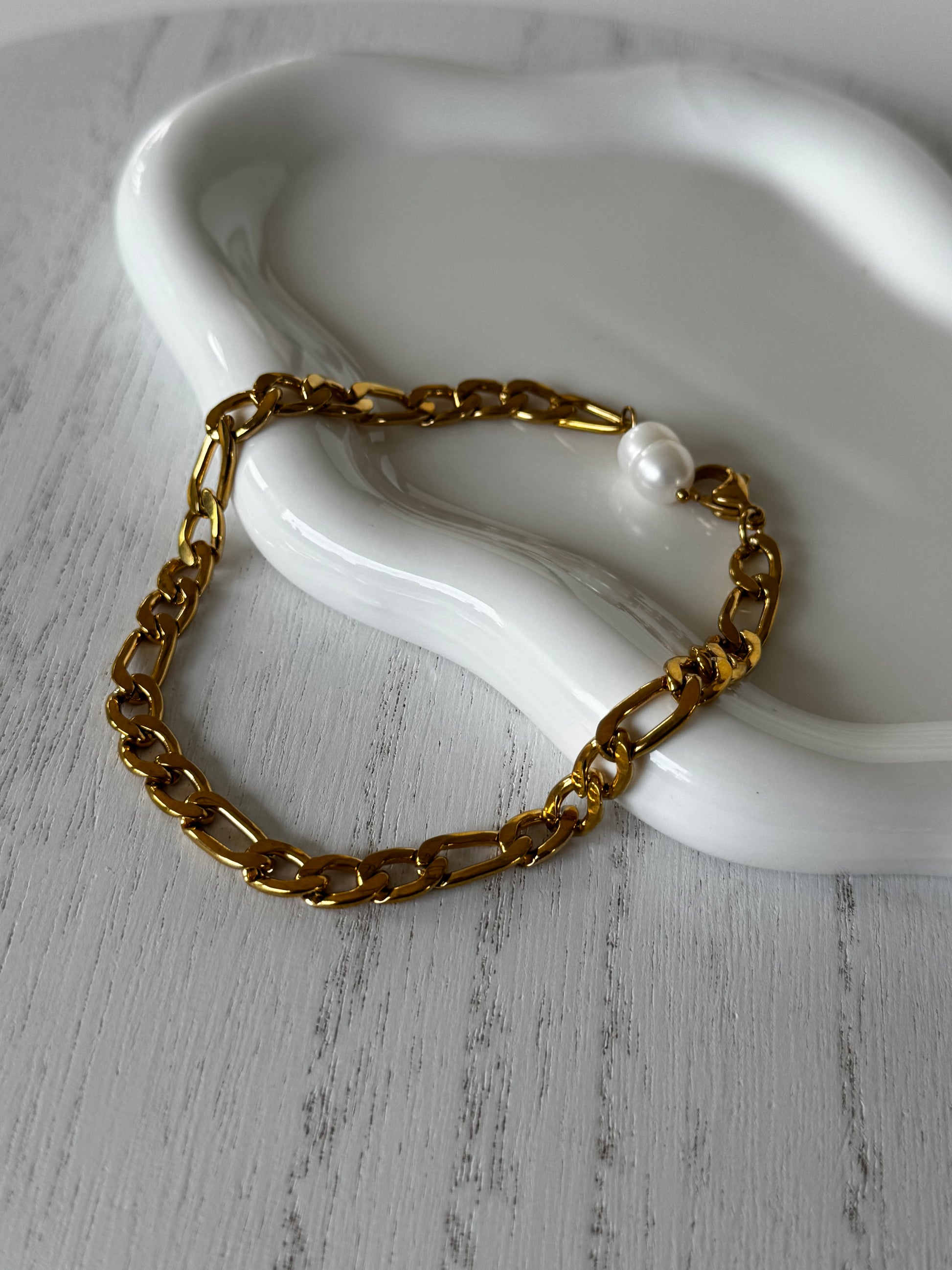 A bold gold anklet with a sleek, thick chain, accented by a charming pearl pendant for a touch of refined allure. Add a touch of extra fashion to your look by layering it or wear alone for a more understated elegance.
