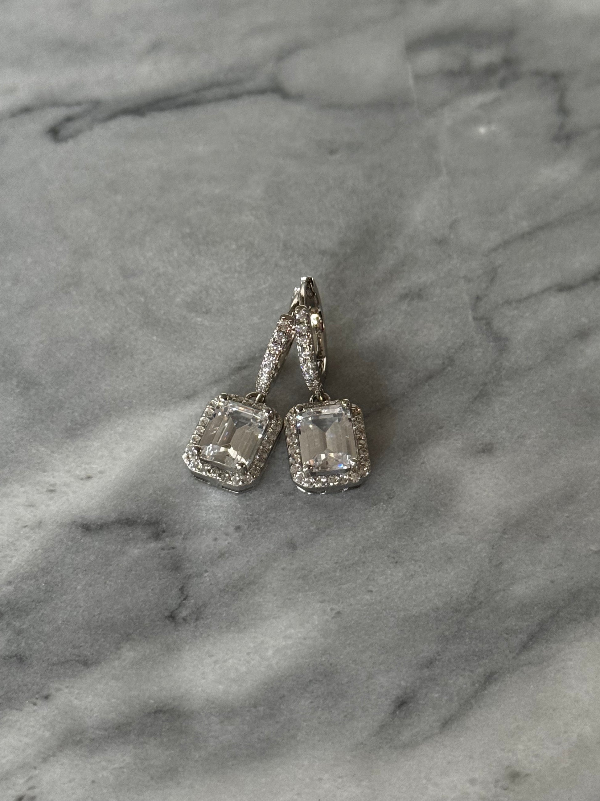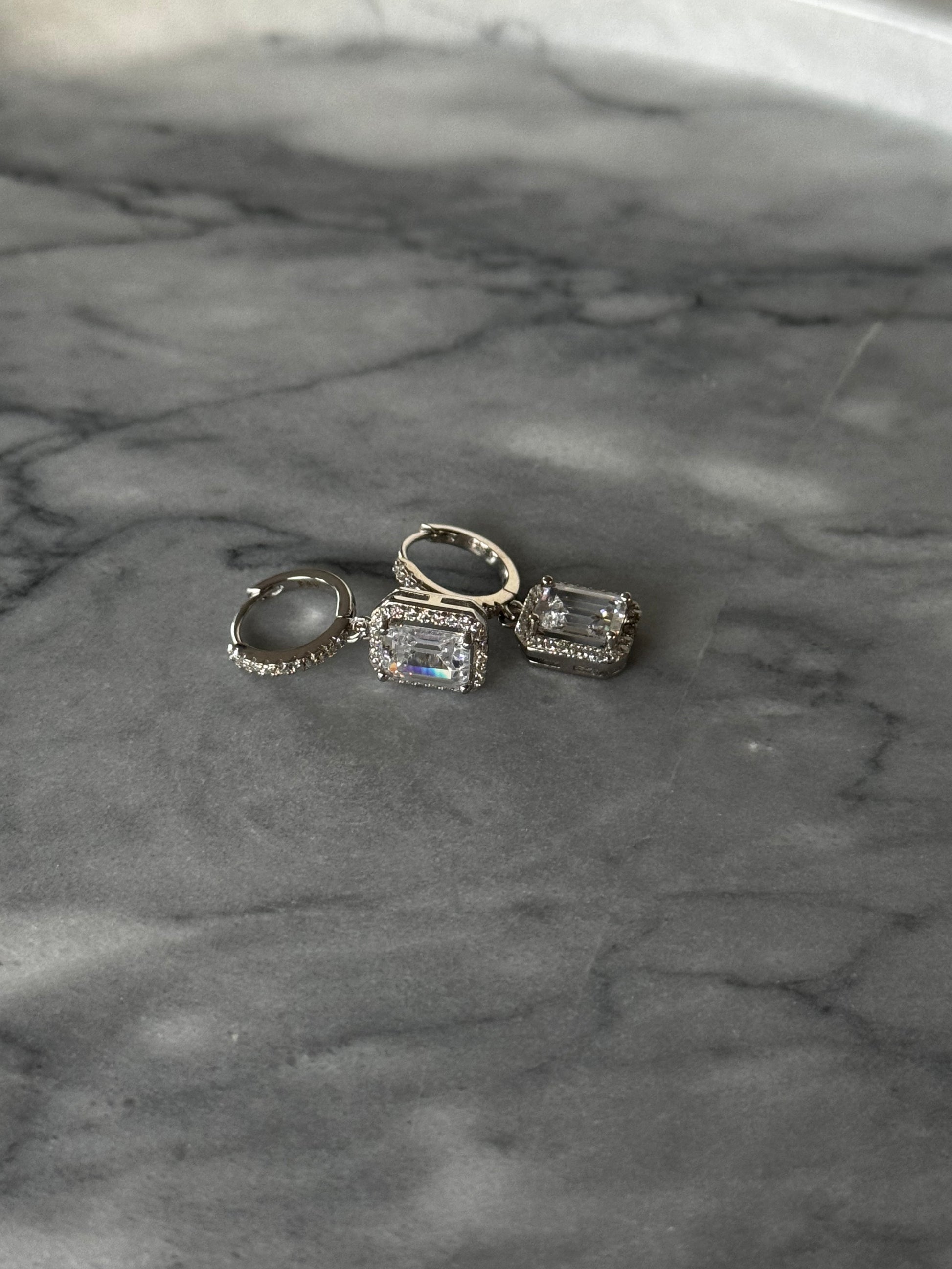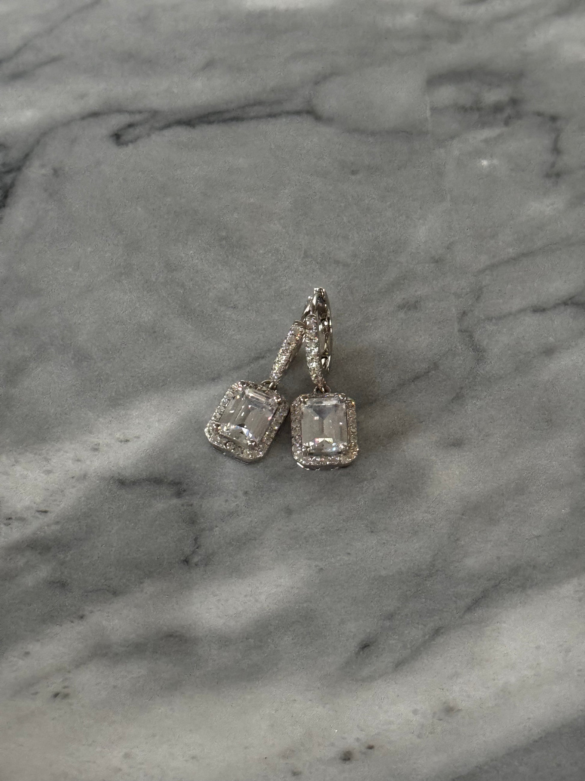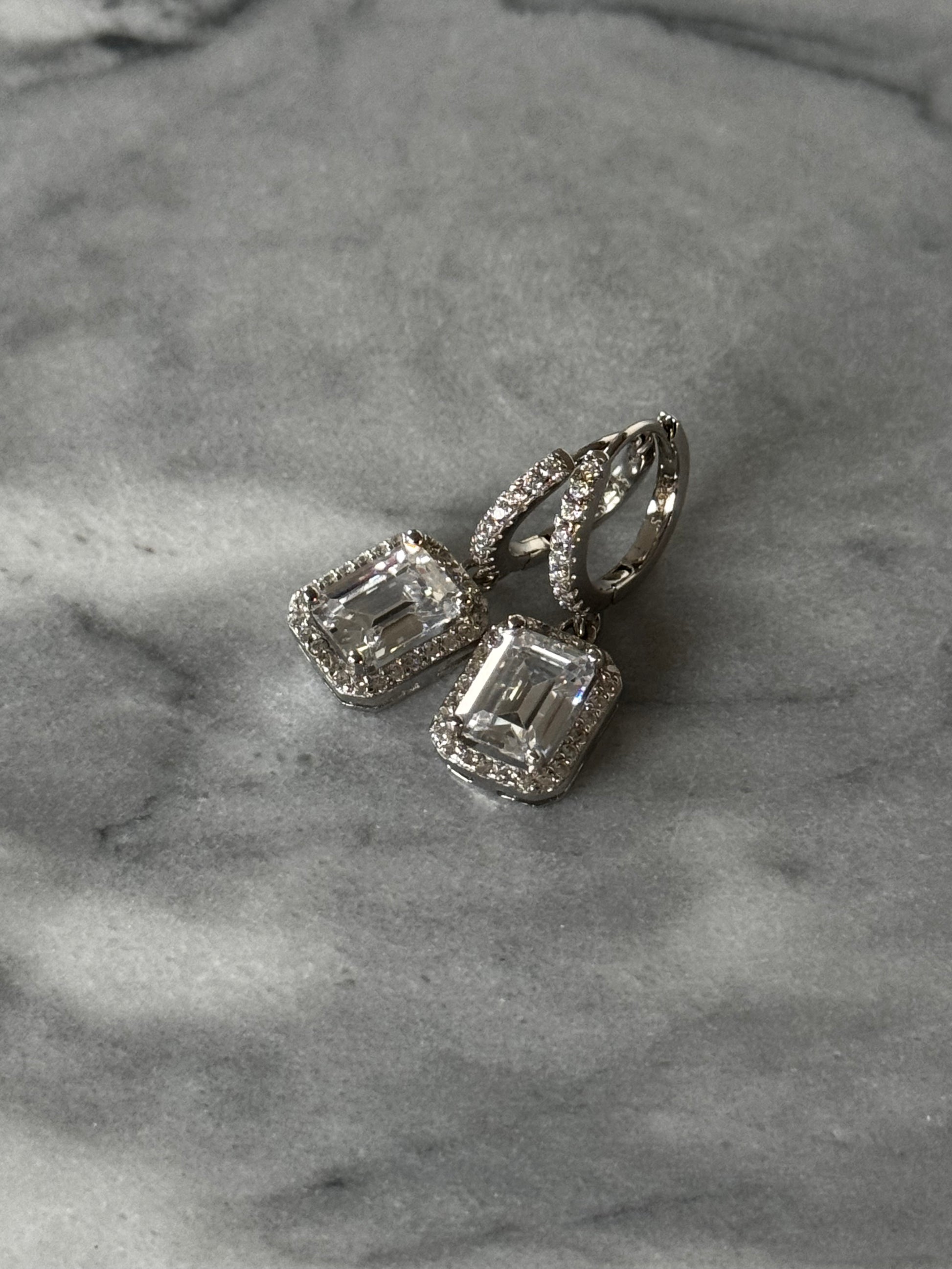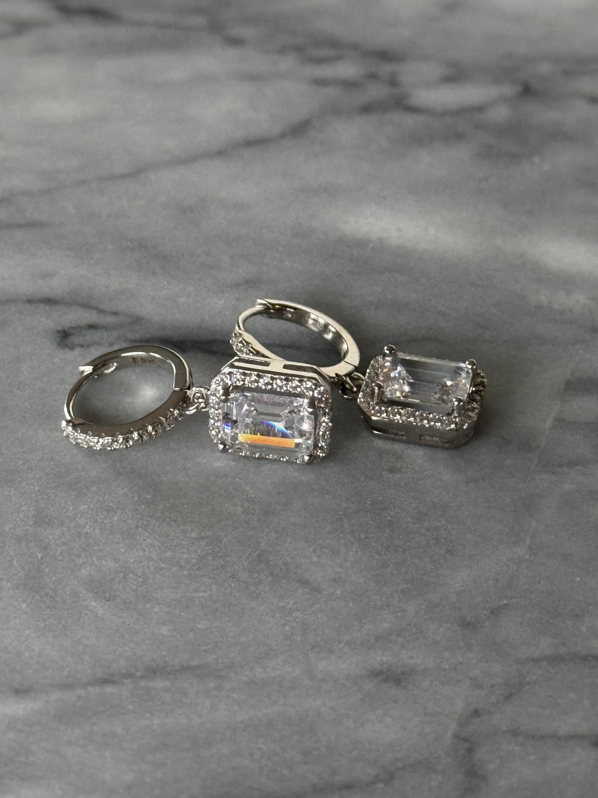 Crafted in 925 sterling silver and paired with a shiny moissanite stone, Ivy will be a showstopper. With the beautiful rectangle moissanite dangling from the all round zircon hoop, it's the kind of design that turns heads the instant you will walk in a room.