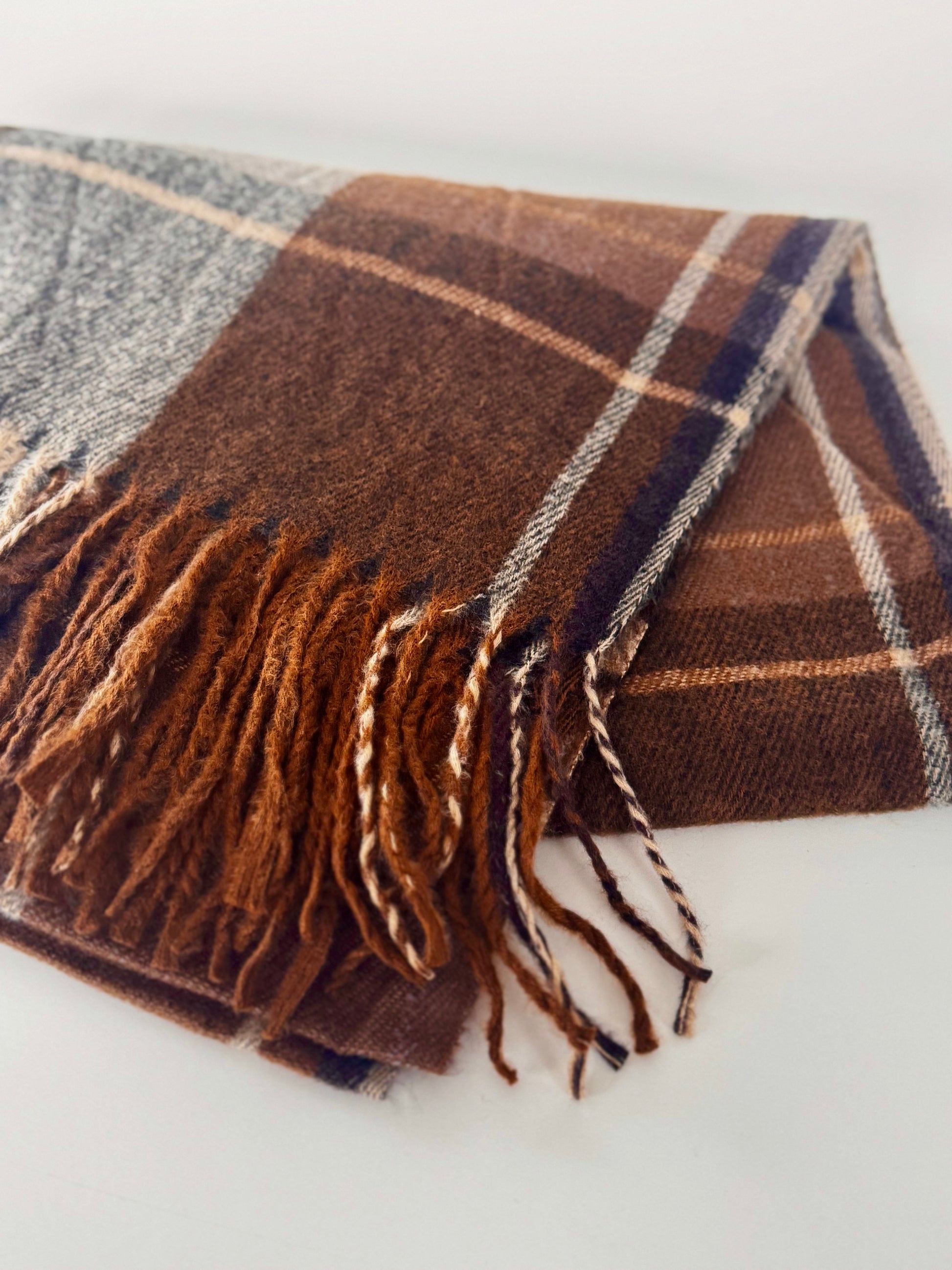 Wrap yourself in effortless elegance, with this soft and cozy scarf. Featuring a refined plaid in rich caramel, brown and charcoal tones. Perfect layered over your favourite coat, it adds a whisper of warmth and sophistication.