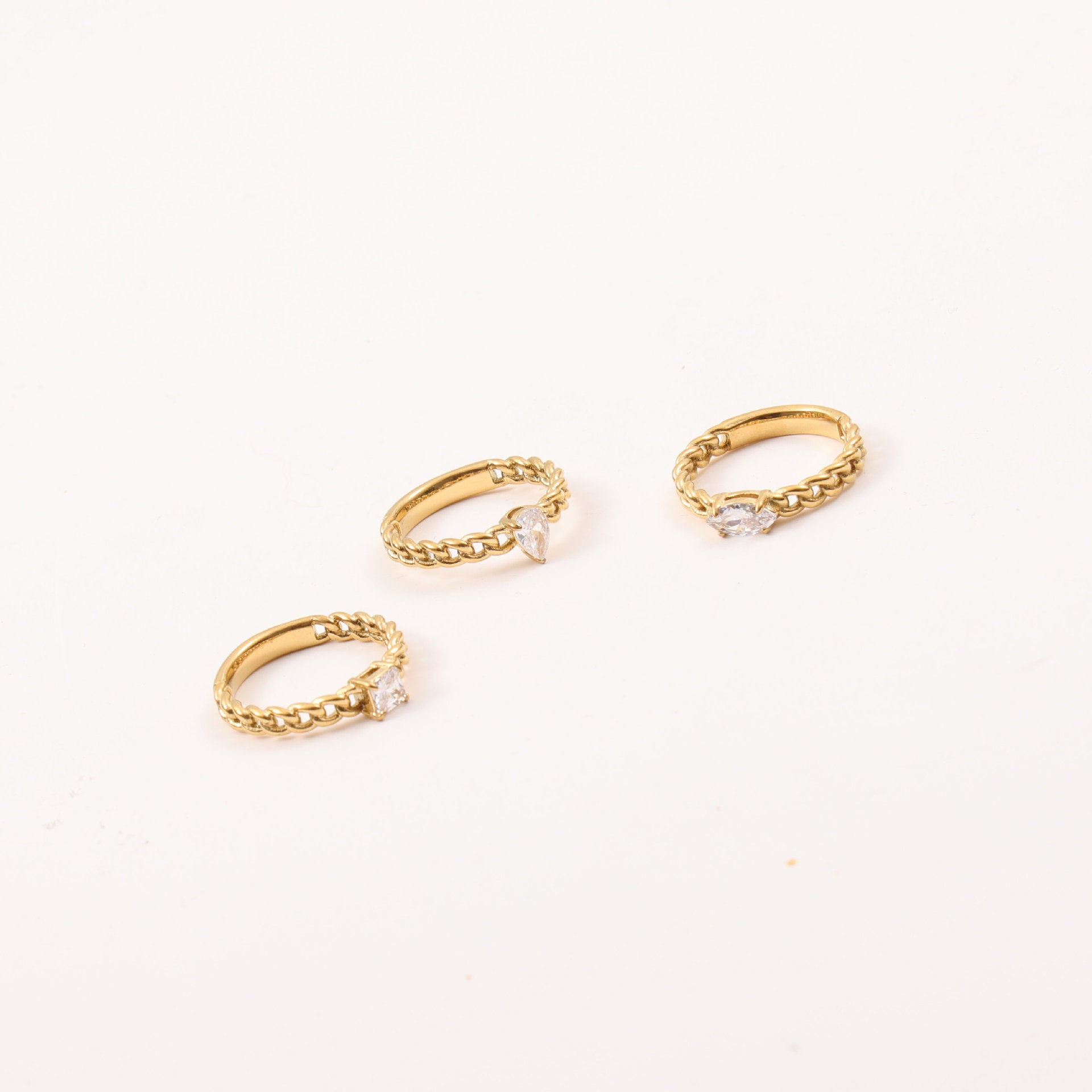 Stylish yet chic, this gold ring brings a touch of charm to your jewelry collection. Designed with a unique chain band with a zircon at its center, available in three eye-catching shapes: square, teardrop, or oval.