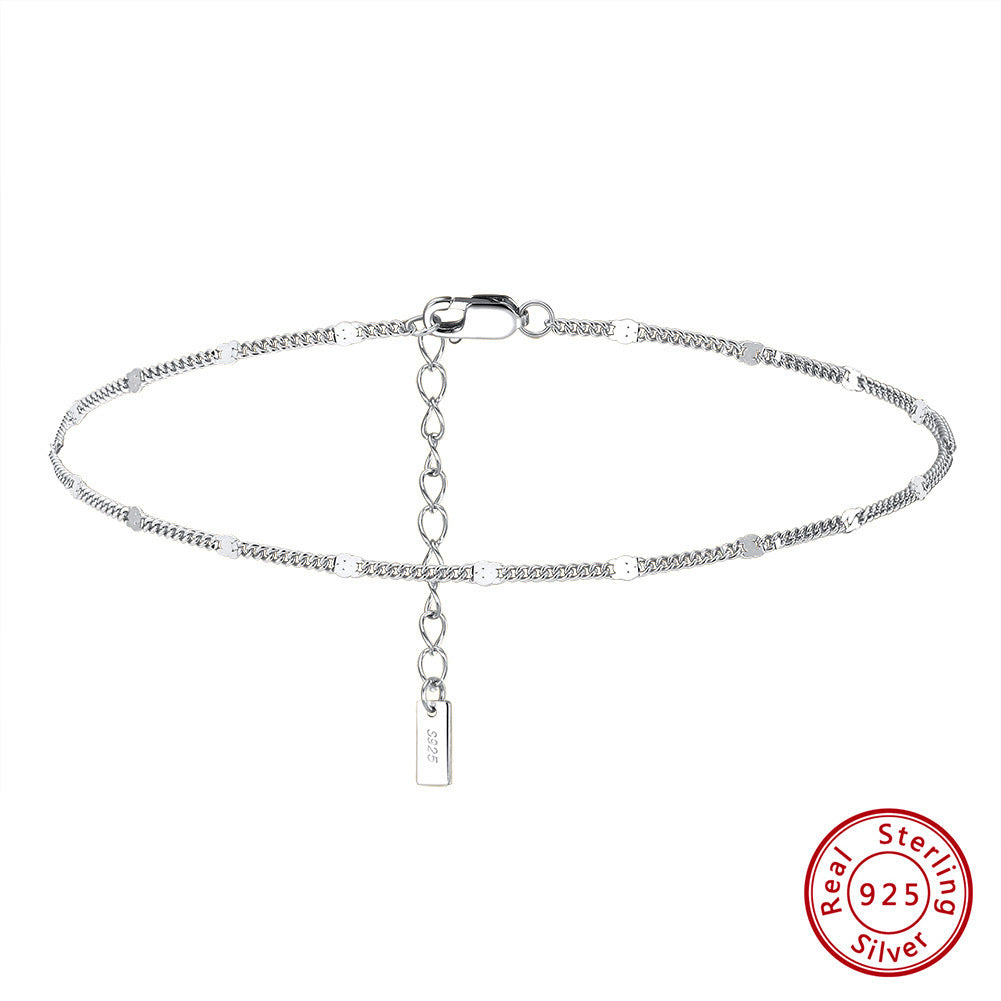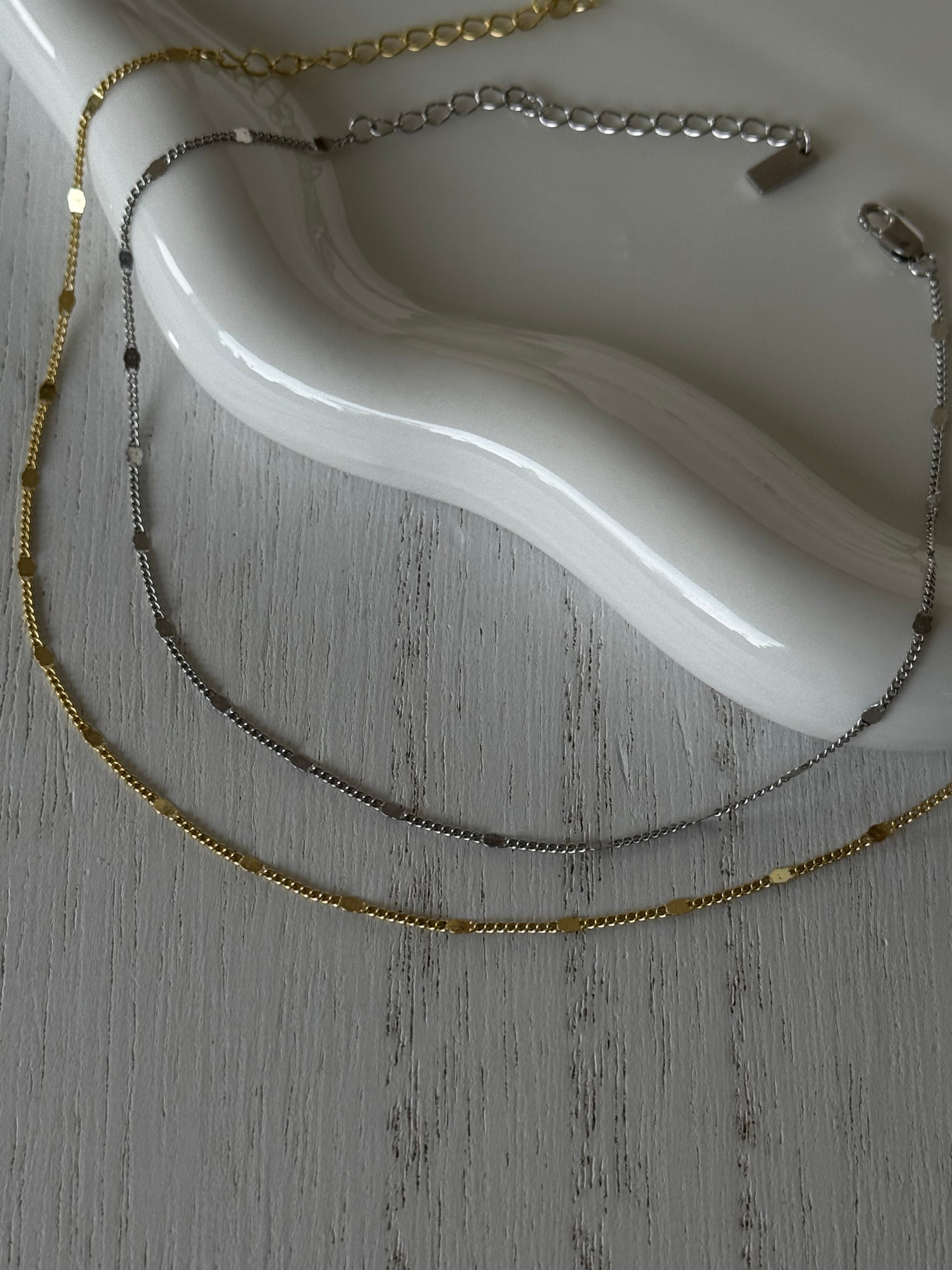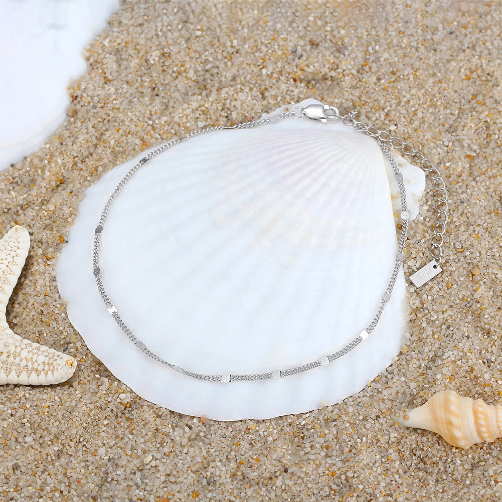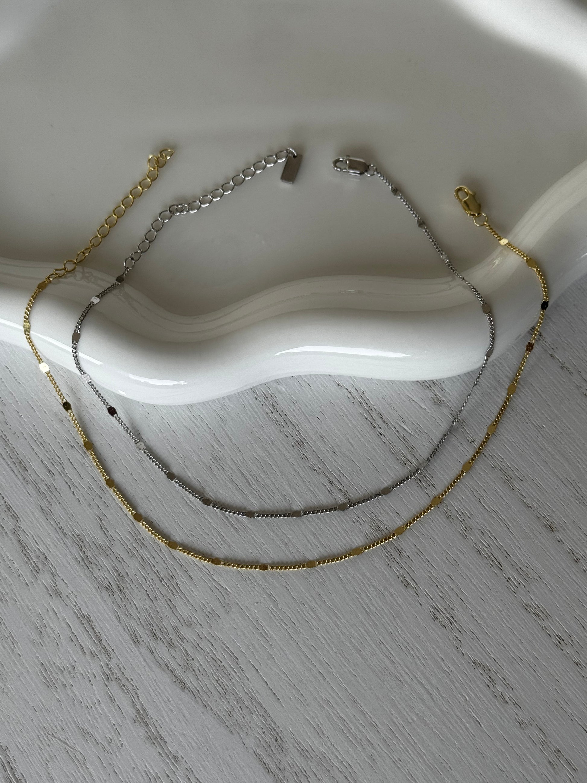 A chic chain anklet adorned with delicate plates, designed to catch the light with every movement. Available in both gold and silver, this versatile piece adds that little something special to elevate any look with effortless style.